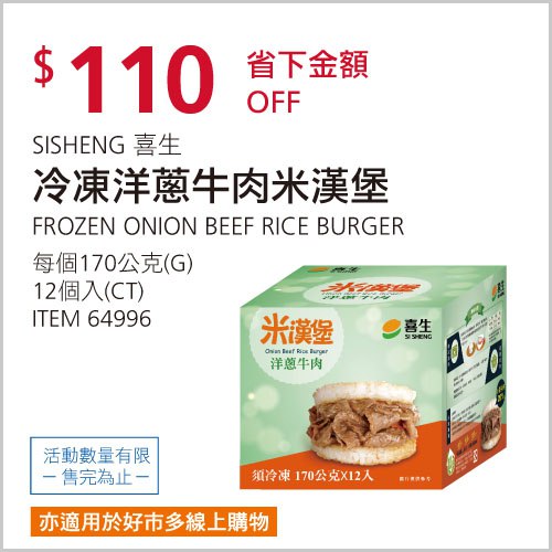 Costco優惠通知,喜生冷凍洋蔥牛肉米漢堡,05/11前情報原價折110元,每年只特價兩次,好市多的長青商品,這次錯過特價下次就等年底囉~